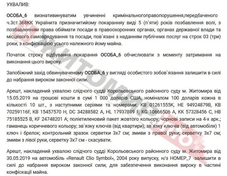 «За публічного обвинувачення прокурора Житомирської обласної прокуратури експосадовця міськради визнано винним в одержанні неправомірної вигоди за невчинення в інтересах того, хто надає таку вигоду, будь-якої дії з використанням наданого їй службового становища (ч. 3 ст. 368 КК України). Його засуджено до 5 років позбавлення волі з конфіскацією майна. Також його позбавлено права обіймати посади в правоохоронних органах, органах державної влади і місцевого самоврядування та посади, пов’язані з наданням публічних послуг строком на три роки. Прокурор у суді довів, що колишній начальник одного з управлінь Житомирської міської ради одержав від підрядника неправомірну вигоду – 1000 доларів США», - йдеться у повідомленні.