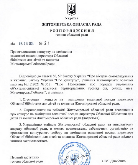 Розпорядження про оголошення конкурсу, яке перший заступник голови облради Олег Дзюбенко підписав 5 вересня 2024 року, 11 вересня оприлюднили на сайті облради.
