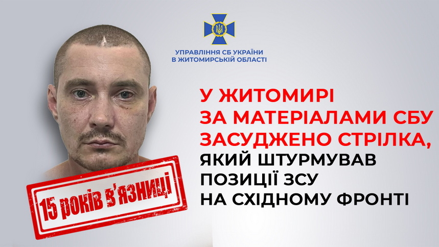 У Житомирі за матеріалами СБУ до 15 років ув’язнення засуджено стрілка зрадника, який допомагав рф штурмувати позиції ЗСУ на Харківщині та Донеччині.