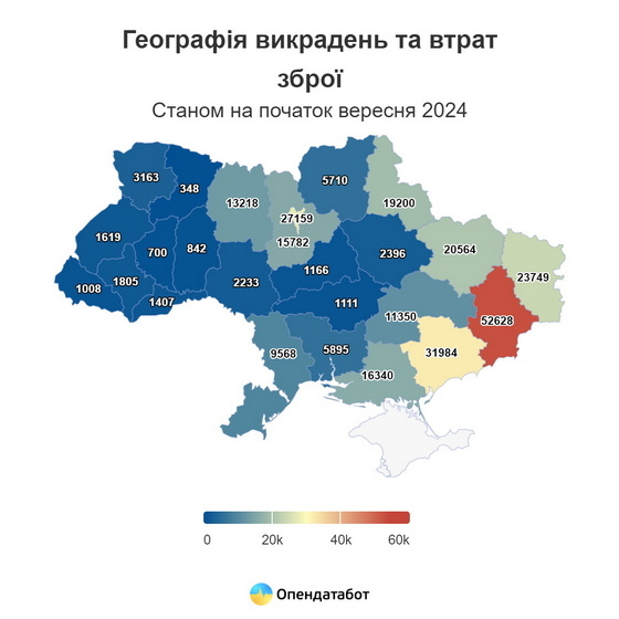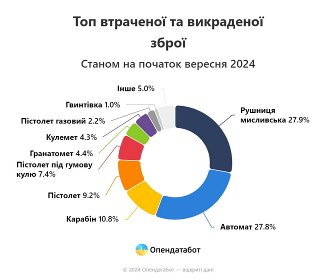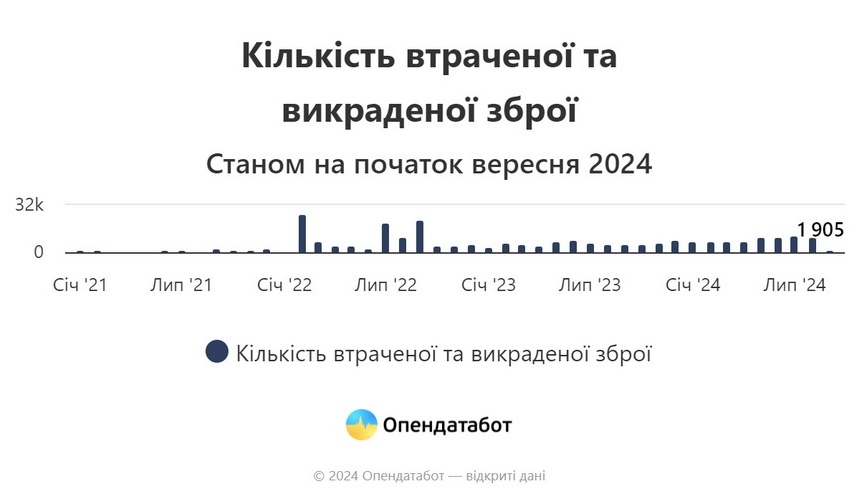Цьогоріч кількість втраченої та викраденої зброї зросла: за неповний 2024 зброї вкрали або загубили більше, аніж за весь минулий рік — 78 217 одиниць. Водночас це у 4 рази більше, ніж до початку повномасштабної.