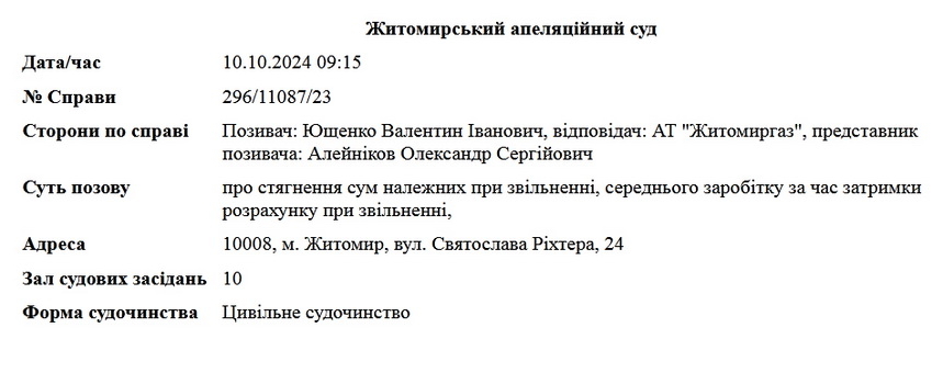 Нагадаємо, в листопаді 2023 року Корольовський районний суд м. Житомира відкрив провадження у справі за позовом Ющенка до акціонерного товариства «Житомиргаз» про стягнення 11 млн 077 тис. 923,9 грн – середній заробіток за час затримки розрахунку при звільненні, недоплачену суму компенсації за невикористані відпустки та вихідну допомогу. Ухвалою від 27 червня 2024 року позовну заяву суд відхилив, бо позивач і його адвокат двічі поспіль не з’явилися на судове засідання.
