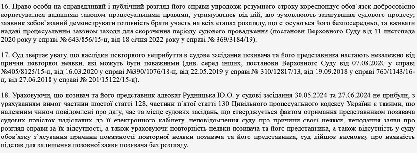 «Представник позивача - адвокат Рудницька Ю.О., яка брала участь у підготовчому засіданні, після закриття підготовчого засідання та призначення справи до розгляду по суті, у судові засідання 30.05.2024 та 27.06.2024 не прибула, причини своєї неявки в останнє судове засідання суду не повідомила, заяви про розгляд справи за її відсутності до суду не подавала. Позивач ОСОБА_2 також у судові засідання 30.05.2024 та 27.06.2024 не прибув, вважається належним чином повідомленим про судові засідання в силу частини п`ятої статті 130 Цивільного процесуального кодексу України, оскільки судові повістки на вказані судові засіданні були отримані його представником – адвокатом Рудницької Ю.О.», - йдеться в ухвалі Корольовського райсуду.