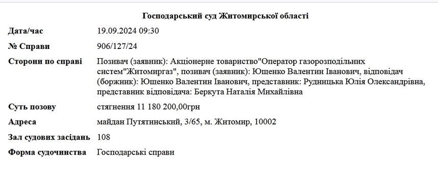 Як повідомляв Житомир.info, в лютому 2024 року Господарський суд Житомирської області відкрив провадження за позовом Акціонерного товариства «Оператор газорозподільних систем "Житомиргаз"» до Валентина Ющенка про стягнення 11 мільйонів збитків, чергове засідання у цій справі призначене на 19 вересня 2024 року.