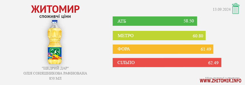 Моніторинг здійснено на основі інформації, отриманої за методом контрольної закупки 13.09.2024 р. у місцях продажу: АТБ, пр. Миру, 15 А, Фора, вул. Лятошинського, 2, Метро, вул. Ватутіна, 55-в, Сільпо, вул. Житній ринок, 1