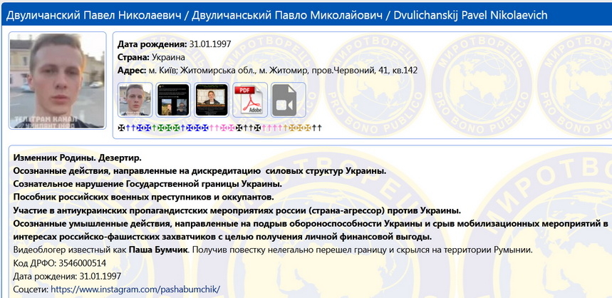 До бази сайту «Миротворець» як зрадника Батьківщини та дезертира внесли уродженця Житомира, відеоблогера Павла Двуличанського, відомого як Паша Бумчик.