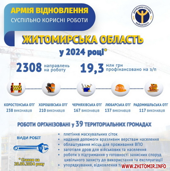 «Роботи ведуться у 39 територіальних громадах. Найбільше людей було задіяно у Коростенській (238 безробітних), Хорошівській (210), Черняхівській (167), Любарській (137) та Радомишльській (117 людей) громадах. На виплату заробітної плати вже профінансовано понад 19 млн грн з державного страхового фонду на випадок безробіття», - йдеться в повідомленні.