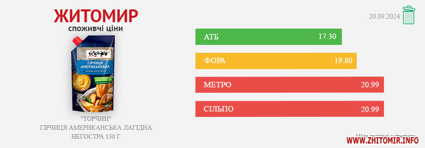 Моніторинг здійснено на основі інформації, отриманої за методом контрольної закупки 20.09.2024 р. у місцях продажу: АТБ, пр. Миру, 15 А, Фора, вул. Лятошинського, 2, Метро, вул. Ватутіна, 55-в, Сільпо, вул. Житній ринок, 1