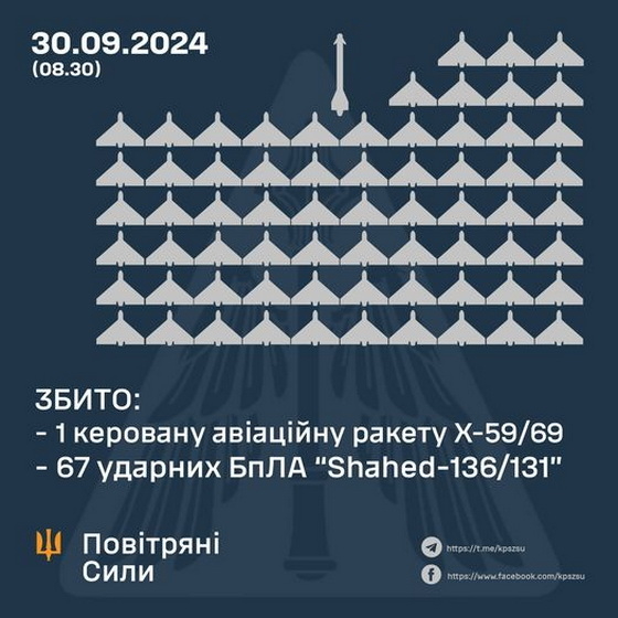 «У ніч на 30 вересня 2024 року (із 19.00 29.09 по 08.00 30.09) ворог завдав удару по Україні ракетами різних типів та ударними БпЛА. Усього радіотехнічними військами Повітряних Сил виявлено та здійснено супровід 76 засобів повітряного нападу противника: однієї балістичної ракети «Іскандер-М» із окупованого Криму; однієї керованої авіаційної ракети Х-59/69 із повітряного простору ТОТ Запорізької обл.; однієї протирадіолокаційної ракети Х-31П із повітряного простору над акваторією Чорного моря; 73 ударних БпЛА типу «Shahed» із районів Курськ, Єйськ, Орел – рф. Відбивали повітряний напад авіація, зенітні ракетні війська, підрозділи РЕБ та мобільні вогневі групи Повітряних Сил та Сил оборони України», - йдеться у повідомленні.