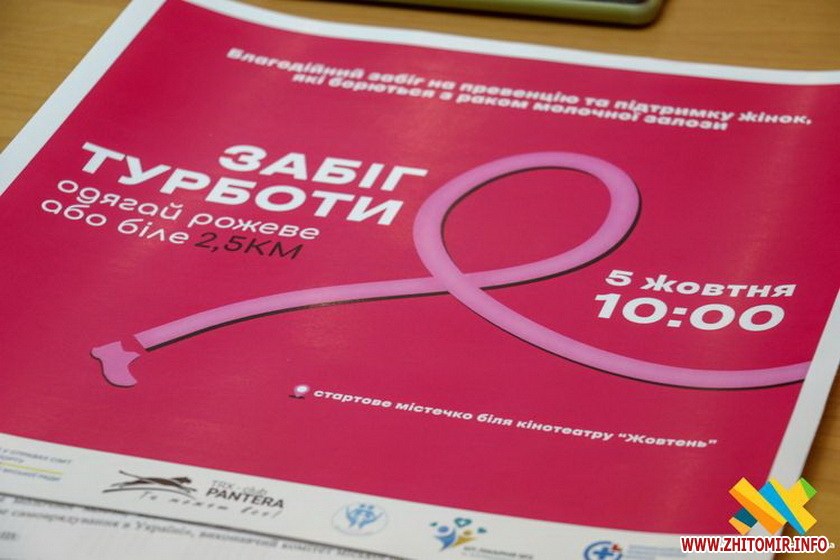 «5 жовтня у Житомирі відбудеться благодійний захід «Забіг турботи» спрямований на привернення уваги до важливості ранньої діагностики та психологічної підтримки хворих. Учасники забігу зможуть не лише підтримати жінок, що ведуть боротьбу з хворобою, але й отримати консультацію від лікарів та зробити свій внесок на підтримку мамологічного центру лікарні №1», - йдеться в повідомленні.