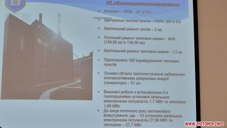 «Котельні центрального пункту забезпечені альтернативними джерелами енергії – це 51 генератори різних потужностей: від 100 кВт до 1,6 МВт, це на найбільшій нашій котельні», – говорить заступник Житомирського міського голови Сергій Кондратюк.