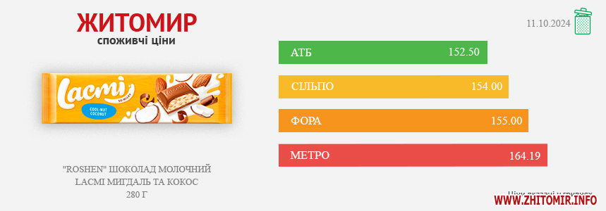 Моніторинг здійснено на основі інформації, отриманої за методом контрольної закупки 11.10.2024 р. у місцях продажу: АТБ, пр. Миру, 15 А, Фора, вул. Лятошинського, 2, Метро, вул. Ватутіна, 55-в, Сільпо, вул. Житній ринок, 1