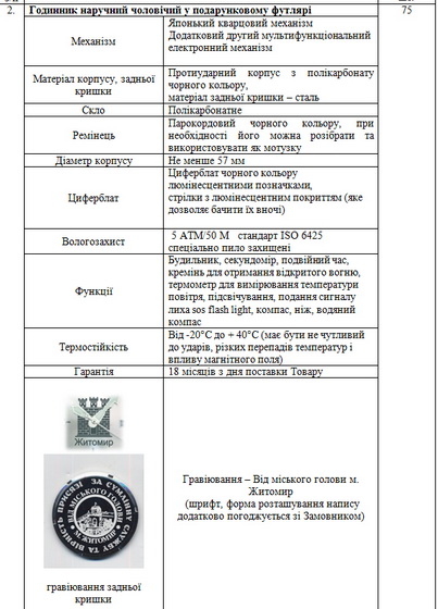 Як повідомляв Житомир.info, Житомирська обласна державна адміністрація 25 жовтня 2022 року уклала договір з ТОВ «Київський годинниковий завод» на закупівлю 21 годинника «TIME-R» загальною вартістю 47 тис. 349 грн: купили 16 чоловічих годинників по 2340 грн за штуку та 5 жіночих по 1980 грн за штуку. У 2023 році всі заступники начальника Житомирської ОВА отримали подарункові годинники.