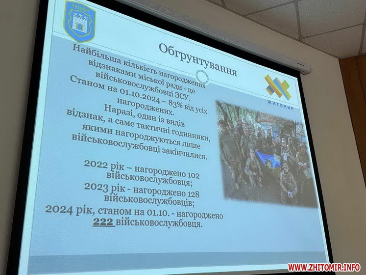 «Найбільша кількість нагороджених відзнакою міської ради – це військовослужбовці Збройних сил України. Станом на 1 жовтня – це 83% від усіх нагороджених. Наразі один із видів відзнак, а саме – тактичні годинники, якими нагороджуються лише військовослужбовці, закінчилися. Трохи статистики – у 2022 році у нас були нагороджені 102 військовослужбовці, 2023 рік – 128, станом на 1 жовтня 2024 року – 222 військовослужбовці. Тому на 2024 рік ми просимо плюс 70 тисяч гривень саме на закупівлю тактичних годинників, на 2025 рік – плюс 100 тис. грн також суто на тактичні годинники», - сказав начальник управління звернень та діловодства міської ради Віталій Скороход.