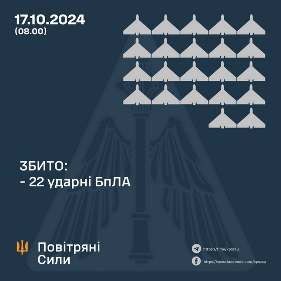 «У ніч на 17 жовтня 2024 року (із 19.30 16.10 по 05.00 17.10) ворог задав удару по Україні керованою авіаційною ракетою Х-59 із повітряного простору Курської обл., а також 56 ударними БпЛА та безпілотниками невстановленого типу (райони пусків: Курськ, Орел, Приморсько-Ахтарськ – рф.). До відбиття нападу залучались авіація, зенітні ракетні війська, підрозділи РЕБ та мобільні вогневі групи Повітряних Сил та Сил оборони України. В результаті протиповітряного бою збито 22 ворожі БпЛА в Сумській, Київській, Полтавській, Чернігівській, Житомирській, Миколаївській, Черкаській, Одеській та Тернопільській областях. Два безпілотники вийшли з повітряного простору в напрямку Білорусі, 27 ударних БПЛА та безпілотників невстановленого типу локаційно втрачено внаслідок активної протидії РЕБ Сил оборони. Зафіксовано 5 влучань ударних БпЛА по об’єктах інфраструктури у прифронтових областях», - йдеться у повідомленні.