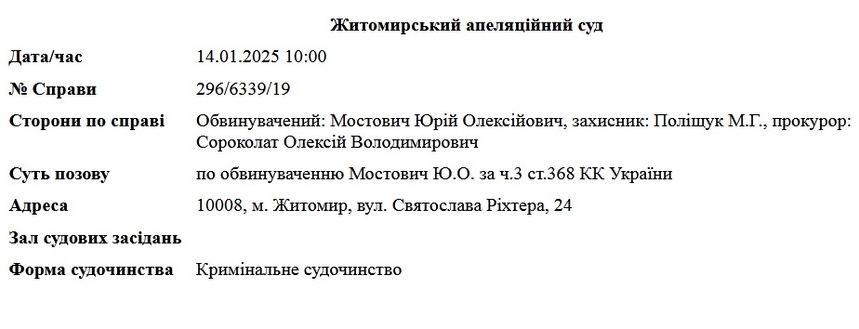 Ухвалою від 14 жовтня 2024 року Житомирський апеляційний суд відкрив провадження за апеляційною скаргою адвоката Юрія Мостовича на вирок Корольовського районного суду м.Житомира від 6 вересня 2024 року.