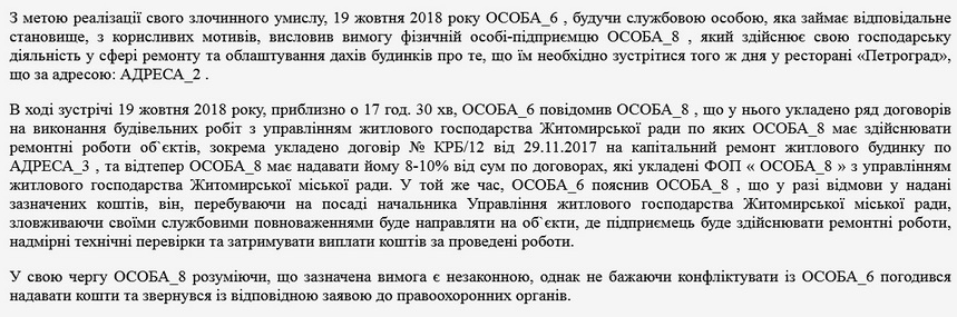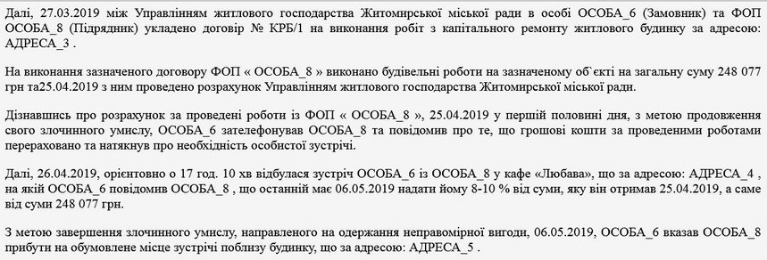 Як повідомляв Житомир.info, 6 травня 2019 року з «відкатом» у 1 тис. доларів від переможця тендеру на проведення будівельних робіт був затриманий начальник управління житлового господарства Юрій Мостович: чиновник пообіцяв приватному підприємцю не чинити тиску та не перешкоджати його господарській діяльності. 2 липня 2019 року до Корольовського районного суду м.Житомира надійшов затверджений обвинувальний акт від 25.06.2019 року в кримінальному провадженні по обвинуваченню начальника управління житлового господарства Юрія Мостовича за ч.3 ст.368 КК України.