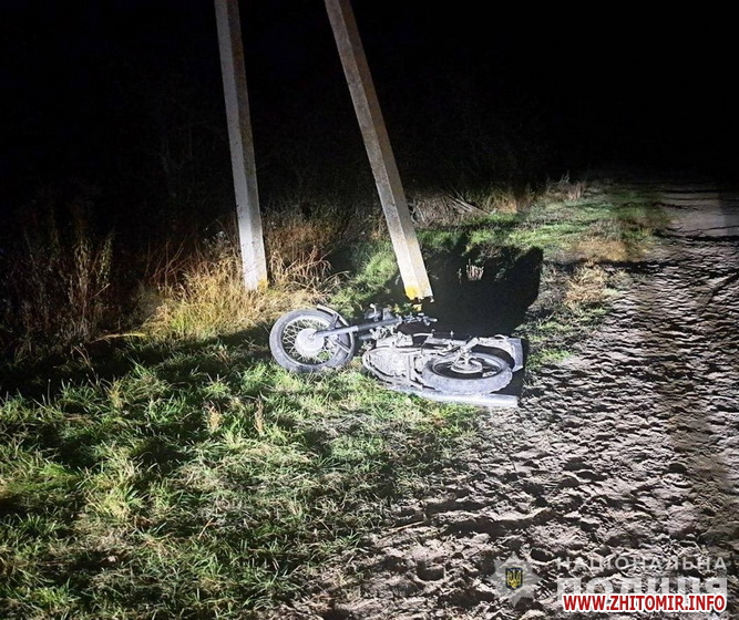 «Дорожньо-транспортна пригода сталася 26 жовтня близько 21:25 у селищі Мар’янівка Довбиської громади. Попередньо, 16-річний житель Житомирського району, керуючи мотоциклом «ИЖ», здійснив наїзд на електроопору. У результаті водій та його 15-річна пасажирка, жителька Житомирського району, отримали травми та були доставлені до лікарні», - йдеться в повідомленні.