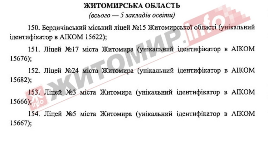 Це Бердичівський міський ліцей №15, ліцей №17 м.Житомира, ліцей №24 м.Житомира, ліцей №3 м.Житомира та ліцей №5 м.Житомира.