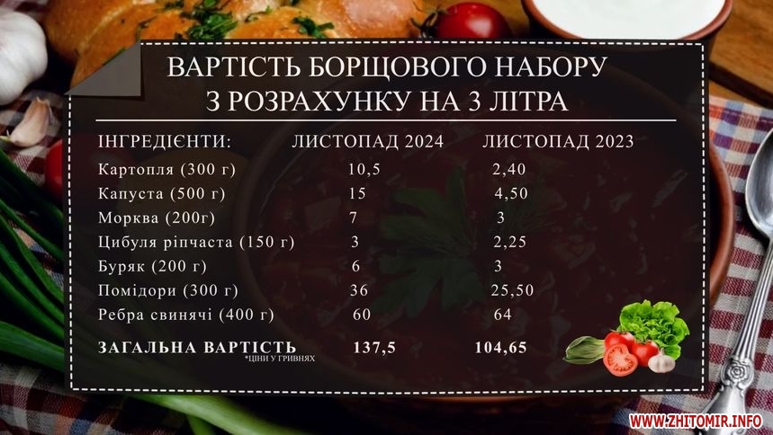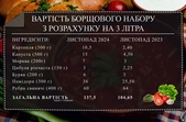 Як повідомляв Житомир.info, 14 листопада 2023 року вартість борщового набору була 104 грн 65 коп., а в травні 2023 року такий самий борщовий набір коштував дорожче – 132 гривні 25 копійок.
