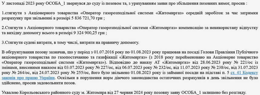 Нагадаємо, в листопаді 2023 року Корольовський районний суд м. Житомира відкрив провадження у справі за позовом Валентина Ющенка до акціонерного товариства «Житомиргаз» про стягнення 11 млн 077 тис. 923,9 грн – середній заробіток за час затримки розрахунку при звільненні, які було 1 серпня 2023 року, недоплачену суму компенсації за невикористані відпустки та вихідну допомогу. Згодом Ющенко збільшив позовні вимоги до 15 млн 161 тис. 621,95 грн: середній заробіток за час затримки розрахунку при звільненні в розмірі 5 млн 836 тис. 721,70 грн; компенсація за невикористану відпустку та вихідну допомогу в розмірі 9 млн 324 тис. 900,25 грн. Ухвалою від 27 червня 2024 року позовну заяву суд відхилив, бо позивач і його адвокат двічі поспіль не з’явилися на судове засідання.