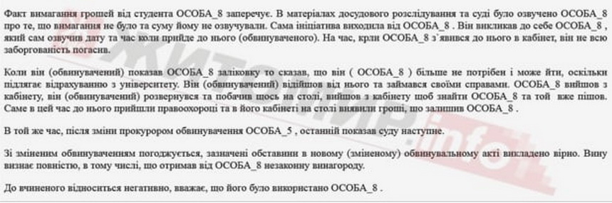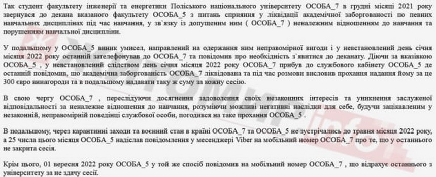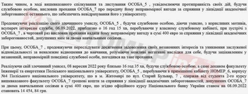 «Реалізуючи свій злочинний умисел, 08 вересня 2022 року близько 16 год 35 хв, будучи службовою особою, а саме деканом факультету Інженерії та енергетики Поліського національного університету, ОСОБА_5 , перебуваючи в приміщенні кабінету НОМЕР_6, корпусу №4 Поліського національного університету, що в м. Житомирі по вул. Старий Бульвар, 7 , одержав від студента 2-го курсу вищевказаного факультету ОСОБА_7 грошові кошти за сприяння у ліквідації академічних заборгованостей, допущених ОСОБА_7 за двома навчальними сесіями в сумі 400 євро, що згідно офіційного курсу Національного банку України станом на 08.09.2022 становить 14 454, 84 грн. Обвинувачений ОСОБА_5 свою вину у вчиненні злочину, передбаченого ст. 368 ч.1 КК України визнав повністю», - йдеться у вироці суду.