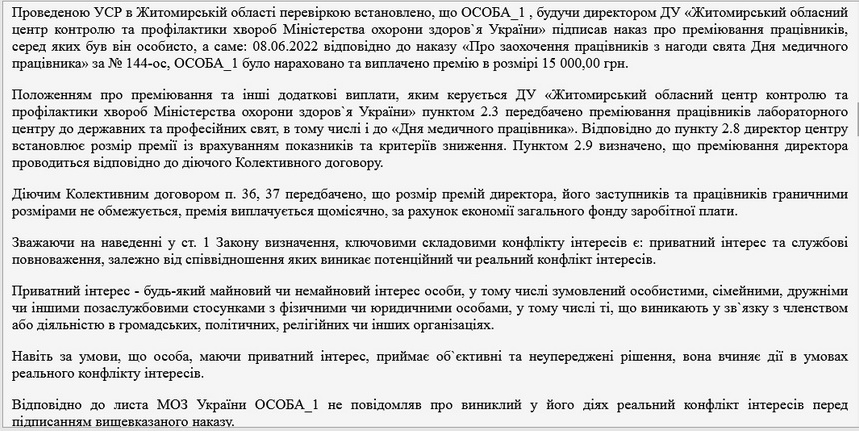 «Суд критично відноситься до стверджень ОСОБА_1 про те, що 06.06.2022 він особисто завіз у МОЗ України заяву-повідомлення про підготовку наказу щодо преміювання працівників установи та себе з нагоди «Дня медичного працівника». У ході дослідження в судовому засіданні копії вказаного листа-повідомлення встановлено, що на ньому відсутні будь-які реквізити ДУ «Житомирський обласний центр контролю та профілактики хвороб МОЗ України» щодо його реєстрації та направлення в МОЗ України. Також згідно з листом МОЗ України від 04.04.2024 № 09-06/14182/2-24, за даними системи електронного документообігу від ОСОБА_1 повідомлення про наявність у нього конфлікту інтересів в період часу з 01 січня 2022 року до 01 липня 2022 року не надходили», - йдеться у постанові.
