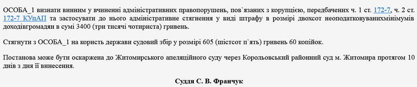 Як повідомляв Житомир.info, Корольовський районний суд м.Житомира постановою від 15 листопада 2023 року визнав Романа Зелінського винним у вчиненні адміністративного правопорушення, пов`язаного з корупцією, та застосував до нього адміністративне стягнення у виді штрафу в розмірі 3400 гривень: справа теж стосувалася преміювання – упродовж 2022 року Зелінський підписав накази про нарахування та виплату собі премій від 24.06.2022 за № 170-ос (розмір премії 15 000,00 грн); 24.06.2022 за № 171-ос (розмір премії 10 000,00 грн); 25.07.2022 за № 233-ос (розмір премії 35 000,00 грн); 16.08.2022 за № 251-ос (розмір премії 30 000,00 грн); 25.08.2022 за № 257-ос (розмір премії 35 000,00 грн); 22.09.2022 за № 279-ос (розмір премії 45 000,00 грн); 17.10.2022 за № 300-ос (розмір премії 9 000,00 грн); 26.10.2022 за № 311-ос (розмір премії 35 000,00 грн). Постановою від 18 квітня 2024 року Житомирський апеляційний суд залишив без задоволення апеляційну скаргу Романа Зелінського, а постанову судді Корольовського райсуду без змін.