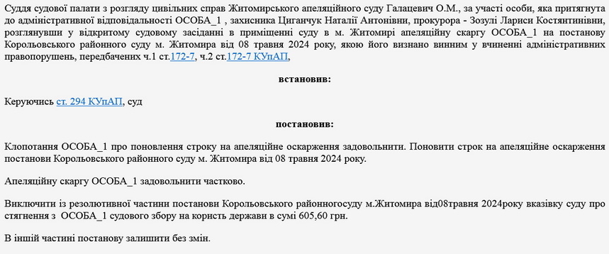Резулятивну частину постанови апеляційного суду, яка була ухвалена 20 листопада 2024 року, оприлюднили 25 листопада.