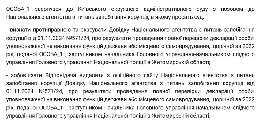 Звільнений заступник начальника ГУНП у Житомирській області Віктор Павліченко у суді оскаржує результати перевірки НАЗК, яка виявила в його декларації недостовірні відомості на майже 12 млн грн.