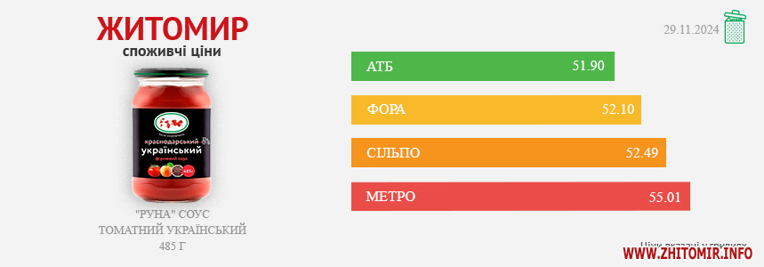 Моніторинг здійснено на основі інформації, отриманої за методом контрольної закупки 29.11.2024 р. у місцях продажу: АТБ, пр. Миру, 15 А, Фора, вул. Лятошинського, 2, Метро, вул. Ватутіна, 55-в, Сільпо, вул. Житній ринок, 1