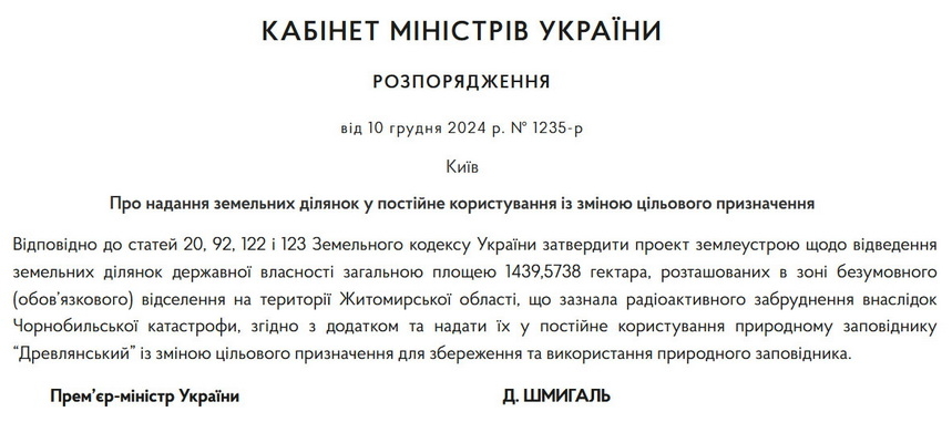 Уряд прийняв відповідне рішення про надання земельних ділянок, що розташовані в Зоні відчуження, у постійне користування природному заповіднику «Древлянський».