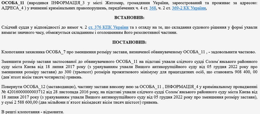 «Зменшити розмір застави застосованої до обвинуваченого ОСОБА_11 на підставі ухвали слідчого судді Солом`янського районного суду міста Києва від 18 липня 2017 року (з урахуванням ухвали Вищого антикорупційного суду від 05 грудня 2022 року про зменшення розміру застави) до 300 (трьохсот) розмірів прожиткового мінімуму для працездатних осіб, що становить 908 400, 00 (дев`ятсот вісім тисяч чотириста) гривень», - зазначається в ухвалі.