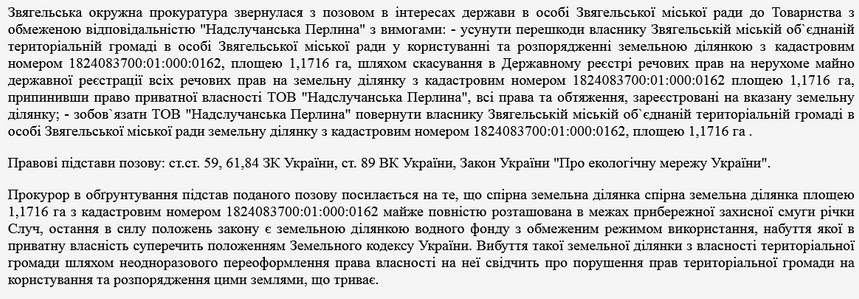 За позовом Звягельської окружної прокуратури скасовано право приватної власності на понад 1 га землі водного фонду, незаконно набуте товариством, та зобов’язано повернути землю Звягельській міській раді.