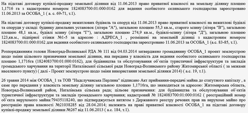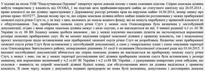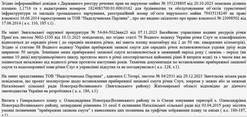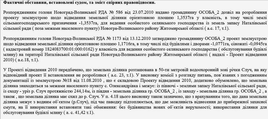 «Йдеться про земельну ділянку комунальної власності, що на березі річки Случ у межах с. Олександрівка Звягельського району. Свого часу землю, розташовану у прибережній захисній смузі, незаконно надано у приватну власність місцевому жителю для ведення особистого селянського господарства та обслуговування будівлі млина. Згодом її неодноразово перепродували. Після чергового продажу право власності набуло рівненське товариство. За його клопотанням неправомірно змінено цільове призначення землі з метою проведення реконструкції млина та інших будівель під об’єкти туристичної інфраструктури, зокрема, готель, ресторан, винний зал тощо», - йдеться у повідомленні.