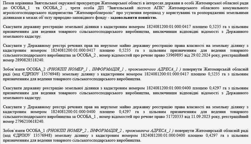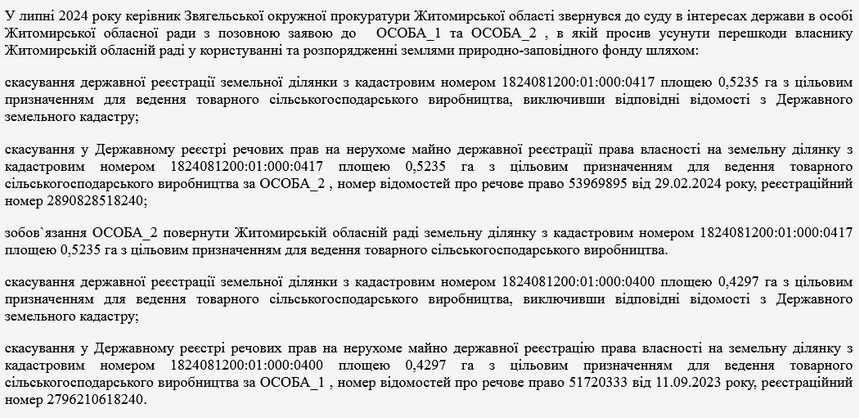 Це стало підставою для звернення окружної прокуратури до Новоград-Волинського міськрайонного суду з позовом про скасування права приватної власності та повернення землі природно-заповідного фонду державі.