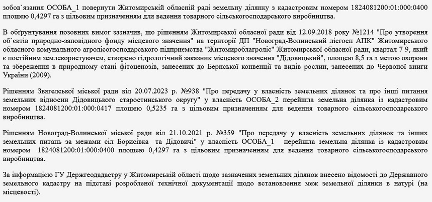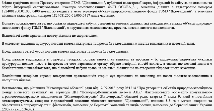 «Звягельська окружна прокуратура довела у суді незаконність надання у приватну власність двох земельних ділянок площею майже один гектар, які належать до природно-заповідного фонду. Йдеться про землю, розташовану у межах гідрологічного заказника місцевого значення «Дідовицький», що на території Звягельської територіальної громади», - йдеться у повідомленні.