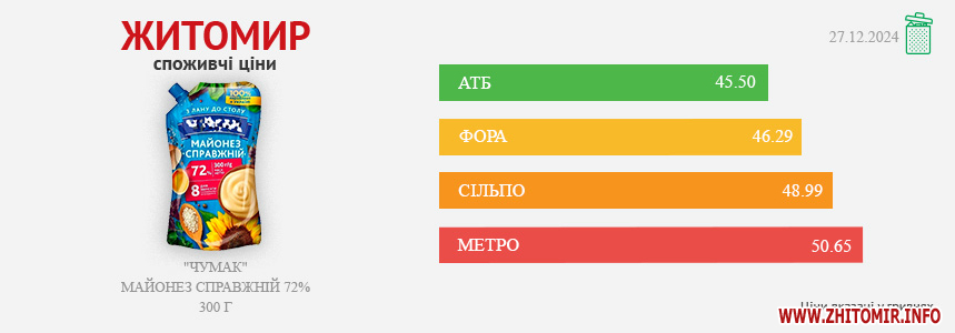 Моніторинг здійснено на основі інформації, отриманої за методом контрольної закупки 27.12.2024 р. у місцях продажу: АТБ, пр. Миру, 15 А, Фора, вул. Лятошинського, 2, Метро, вул. Ватутіна, 55-в, Сільпо, вул. Житній ринок, 1