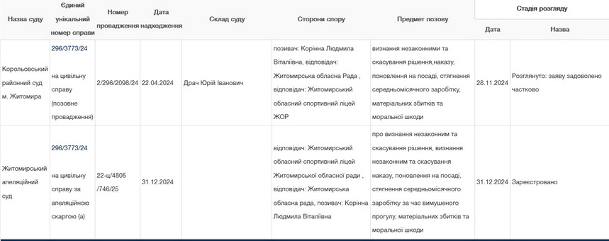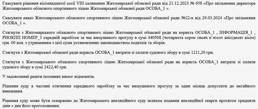 Позов заявниці суд задовольнив частково: скасував рішення сесії Житомирської обласної ради від 21.12.2023 № 658 про звільнення директора Житомирського обласного спортивного ліцею; скасував наказ Житомирського обласного спортивного ліцею №22-к від 29.03.2024 про звільнення Людмили Корінної; стягнув з Житомирського обласного спортивного ліцею на користь позивачки середній заробіток за час вимушеного прогулу (за період 1 квітня по 28 листопада 2024 року) в сумі 440 тис. 568 грн.
