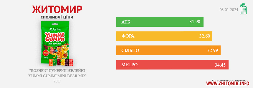 Моніторинг здійснено на основі інформації, отриманої за методом контрольної закупки 03.01.2025 р. у місцях продажу: АТБ, пр. Миру, 15 А, Фора, вул. Лятошинського, 2, Метро, вул. Ватутіна, 55-в, Сільпо, вул. Житній ринок, 1