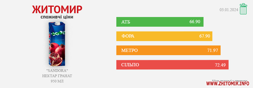 Моніторинг здійснено на основі інформації, отриманої за методом контрольної закупки 03.01.2025 р. у місцях продажу: АТБ, пр. Миру, 15 А, Фора, вул. Лятошинського, 2, Метро, вул. Ватутіна, 55-в, Сільпо, вул. Житній ринок, 1