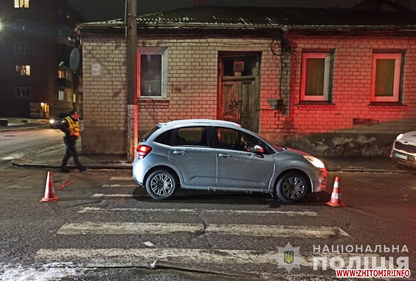 «На місцях подій працювала слідчо-оперативна група Житомирського райуправління поліції. 13 січня близько 16:40 до поліції надійшло повідомлення про дорожньо-транспортну пригоду по вулиці Троянівській у місті Житомирі. За попередньою інформацією, 28-річна жителька Новоборівської громади, керуючи автомобілем «Citroen», рухалась у напрямку вулиці Перемоги та здійснила наїзд на чоловіка, який переходив автошлях. Внаслідок ДТП пішохід, 38-річний житомирянин, отримав травми і був доставлений до медичного закладу», - йдеться в повідомленні.