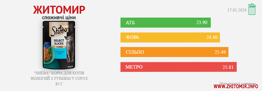 Моніторинг здійснено на основі інформації, отриманої за методом контрольної закупки 17.01.2025 р. у місцях продажу: АТБ, пр. Миру, 15 А, Фора, вул. Лятошинського, 2, Метро, вул. Ватутіна, 55-в, Сільпо, вул. Житній ринок, 1