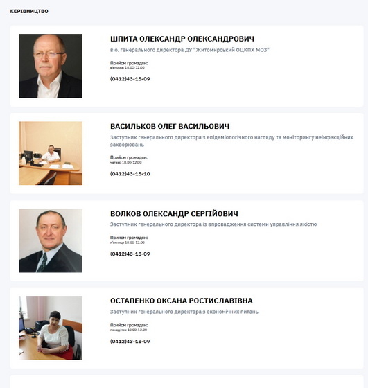Відповідно до наказу Міністерство охорони здоров’я України від 21 січня 2025 року №4-О з 22 січня 2025 року виконуючим обов’язки генерального директора Державної установи «Житомирський обласний центр контролю та профiлактики хвороб МОЗ України» призначено Шпиту Олександра Олександровича.