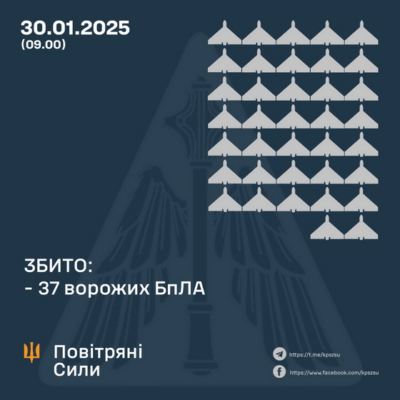 Станом на 09.00 підтверджено збиття 37-ми ударних БпЛА типу «Shahed» та безпілотників інших типів у Полтавській, Сумській, Київській, Черкаській, Кіровоградській, Житомирській, Хмельницькій, Дніпропетровській, Херсонській та Одеській областях.