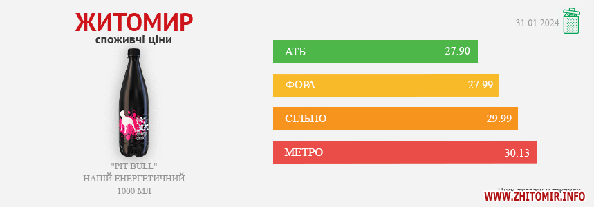 Моніторинг здійснено на основі інформації, отриманої за методом контрольної закупки 31.01.2025 р. у місцях продажу: АТБ, пр. Миру, 15 А, Фора, вул. Лятошинського, 2, Метро, вул. Ватутіна, 55-в, Сільпо, вул. Житній ринок, 1