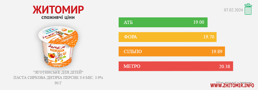 Моніторинг здійснено на основі інформації, отриманої за методом контрольної закупки 07.02.2025 р. у місцях продажу: АТБ, пр. Миру, 15 А, Фора, вул. Лятошинського, 2, Метро, вул. Ватутіна, 55-в, Сільпо, вул. Житній ринок, 1