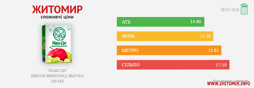 Моніторинг здійснено на основі інформації, отриманої за методом контрольної закупки 28.02.2025 р. у місцях продажу: АТБ, пр. Миру, 15 А, Фора, вул. Лятошинського, 2, Метро, вул. Ватутіна, 55-в, Сільпо, вул. Житній ринок, 1