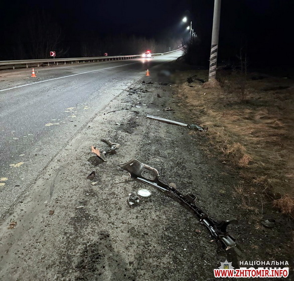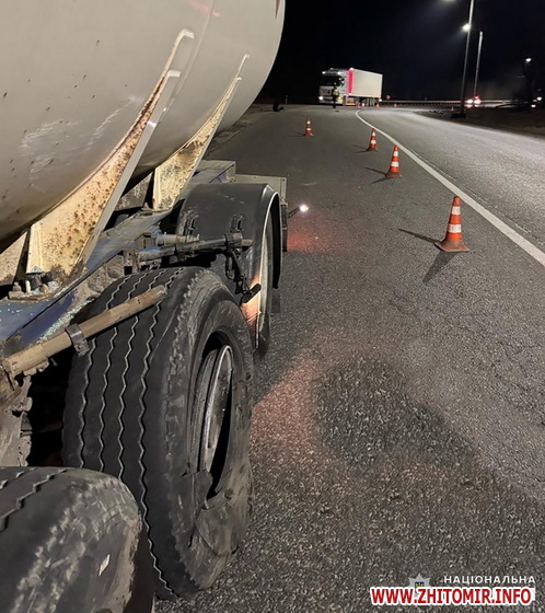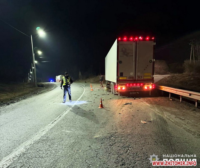 «Дорожньо-транспортна пригода сталася 10 березня на автодорозі Виступовичі – Житомир - Могилів-Подільський, поблизу с. Хажина Семенівської громади. Попередньо встановлено, що близько 23:00 водій автомобіля «BMW X5», 35-річний місцевий житель, виїхав на смугу зустрічного руху, де сталося зіткнення з автоцистерною «DAF». Після цього некерований автомобіль зіткнувся з вантажівкою «Mercedes», - йдеться в повідомленні.