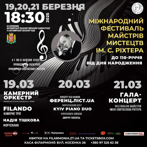 Не пропустіть можливість стати частиною цього свята класичної музики! Фестиваль відбудеться 19-21 березня у Житомирській обласній філармонії ім. Святослава Ріхтера.