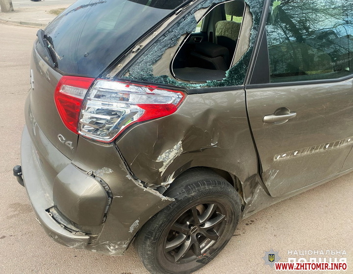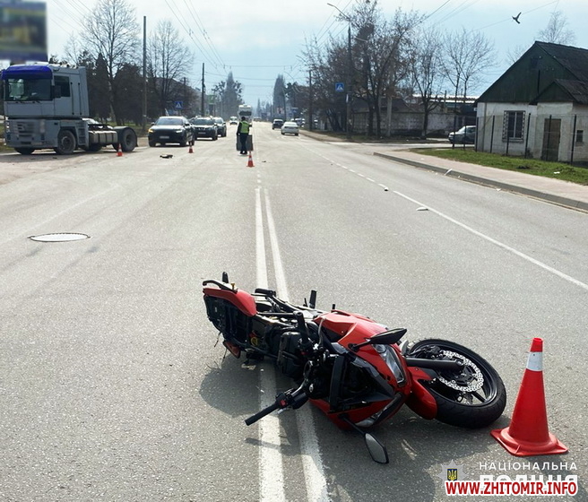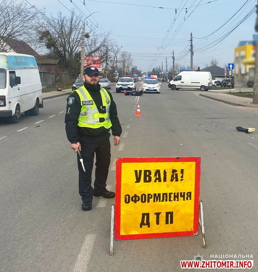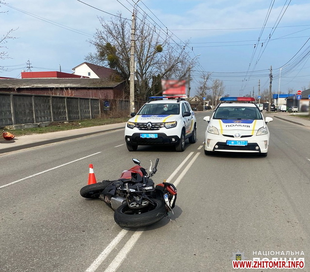 «Дорожньо-транспортна пригода сталася 27 березня на вул. Сергія Параджанова. На місці події працювала слідчо-оперативна група Житомирського райуправління № 2. Попередньо встановлено, близько 8:50 відбулося зіткнення автомобіля «Citroen Picasso», під керуванням 65-річної жительки с. Довжик, та мотоцикла «Kawasaki Ninja», - йдеться в повідомленні.